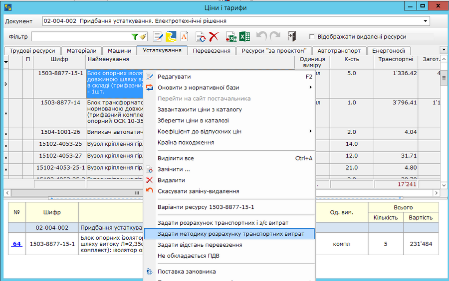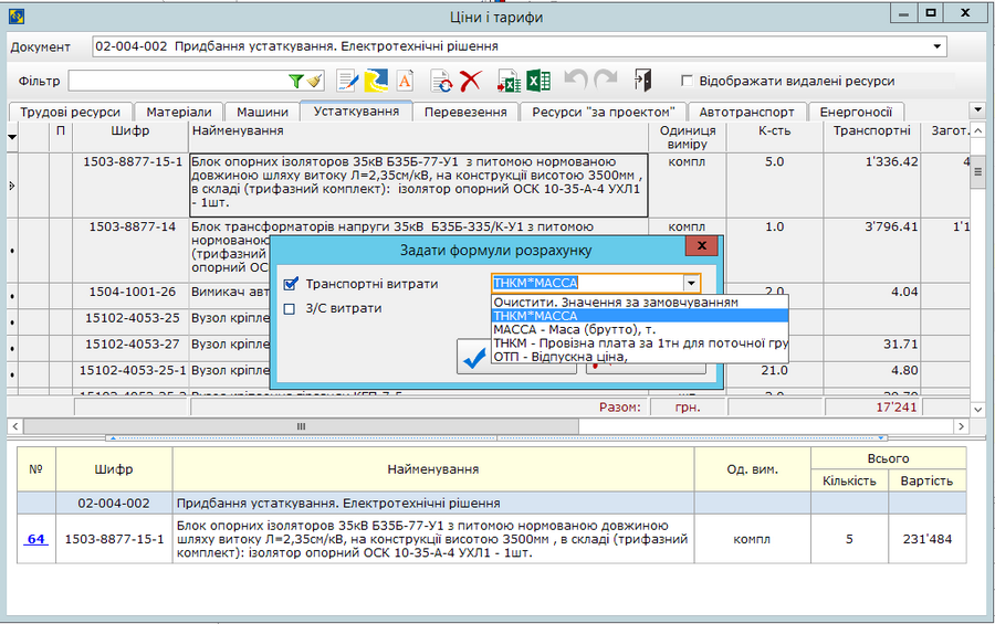 Щоб застосувати отриману ціну до ресурсу локального кошторису, натисніть кнопку «Застосувати ціну ресурсу». Щоб замінити ресурс локального кошторису на вибраний у списку матеріал, натисніть кнопку «Замінити ресурс» (заміна ресурсу доступна, якщо у списку матеріалів вибрано лише одну позицію), див. рис. 2.